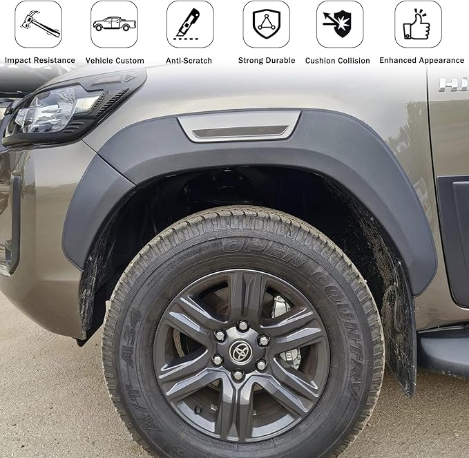 Revo Rocco Fender Flares are designed for Toyota Hilux Revo/Rocco models, offering aggressive styling, added tire coverage, and protection against mud, rocks, and debris. They are made from durable ABS plastic and enhance both aesthetics and off-road functionality.